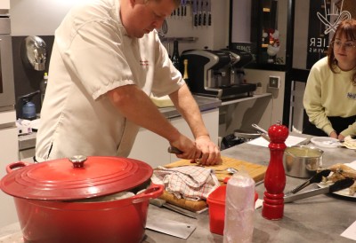 Vendredi 12 décembre 2025 de 8h30 à 12h30. Rendez-vous 10 mn avant au stand de l'Office de tourisme (parvis marché couvert), avenue du Champ de Foire Déplacement à pied ensuite au restaurant pour le cours de cuisine.