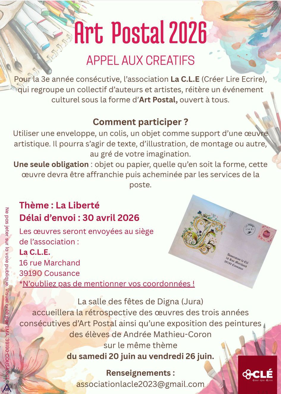 Utiliser une enveloppe, un colis, un objet comme support d'une œuvre artistique. Il pourra s'agir de texte, d'illustration, de montage ou autre. Une seule obligation : objet ou papier, quelle qu'en soit la forme, cette œuvre devra être affranchie puis acheminée par les services de la poste à La C.L.E 16 rue Marchand 39190 Cousance, sans oublier vos coordonnées. Date limite d'envoi : le 30 avril 2026.