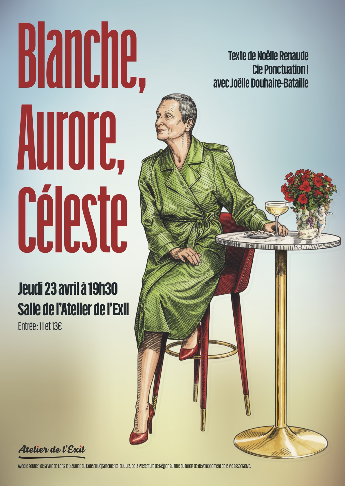 "Blanche Aurore Céleste" d'après Noëlle Renaude avec Joëlle Douhaire-Bataille. C’est une quête, quête d’amour, quête de soi-même, une fuite en avant rocambolesque et mélancolique. C’est une femme mûre qui se souvient. Elle a cherché toute sa vie son grand amour et en a essayé plusieurs. Elle nous raconte sa vie de femme libre et nous croque tous les hommes qu’elle a connus, dans un récit pa- thétique et loufoque. Une histoire d’amour pleine de couleurs, de rencontres et de ruptures. Celle d’une femme qui se raconte en faisant le compte des hommes qu’elle a connus. Et il y en a beaucoup. Beaucoup de micro histoires qui finissent par la décrire en creux. »