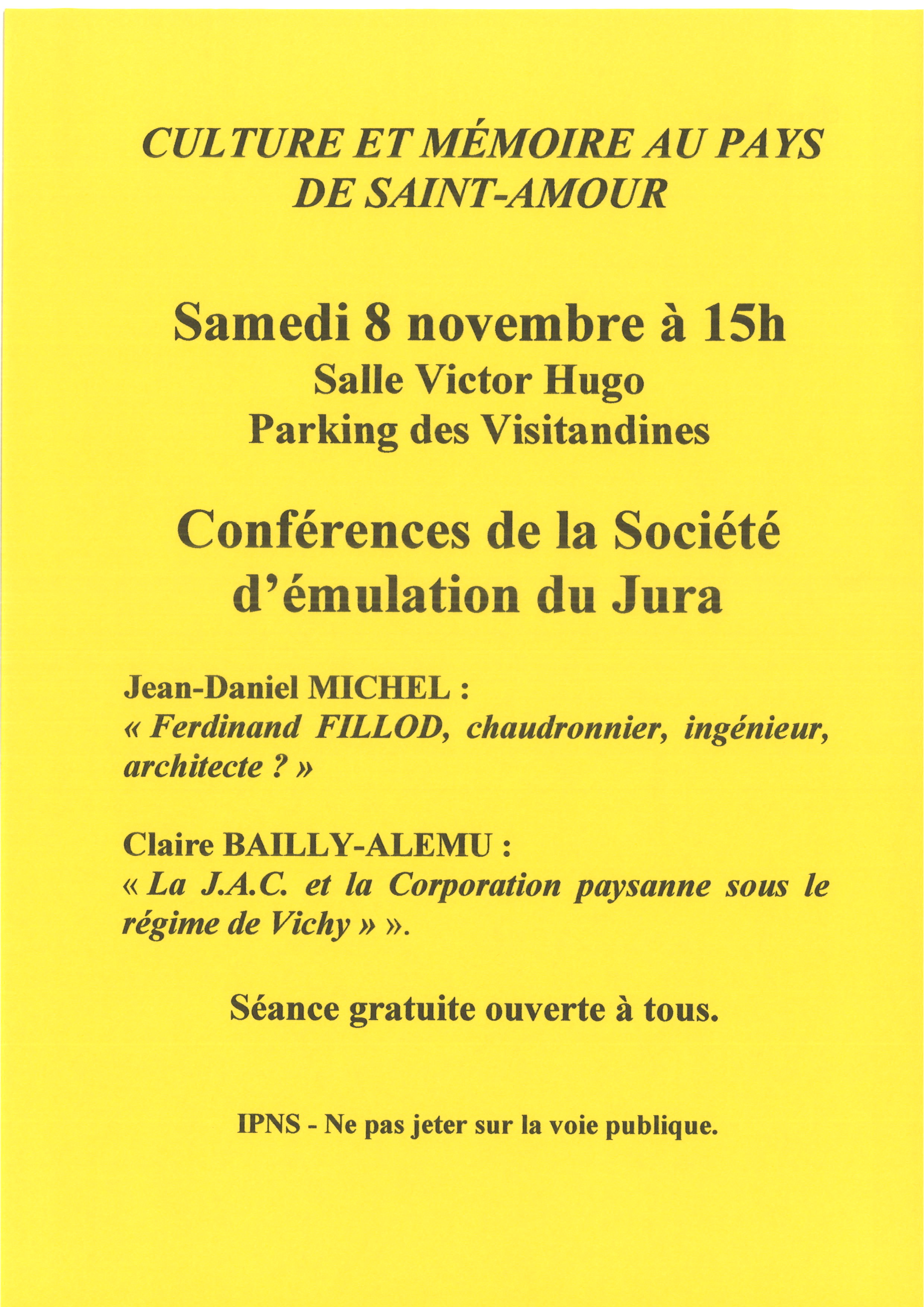 La prochaine séance mensuelle de la Société d’émulation du Jura aura lieu le samedi 8 novembre, à 15 heures, à Saint-Amour, salle Victor Hugo (tout près du parking des Visitandines) et avec l'Association Culture et Mémoire au Pays de Saint-Amour