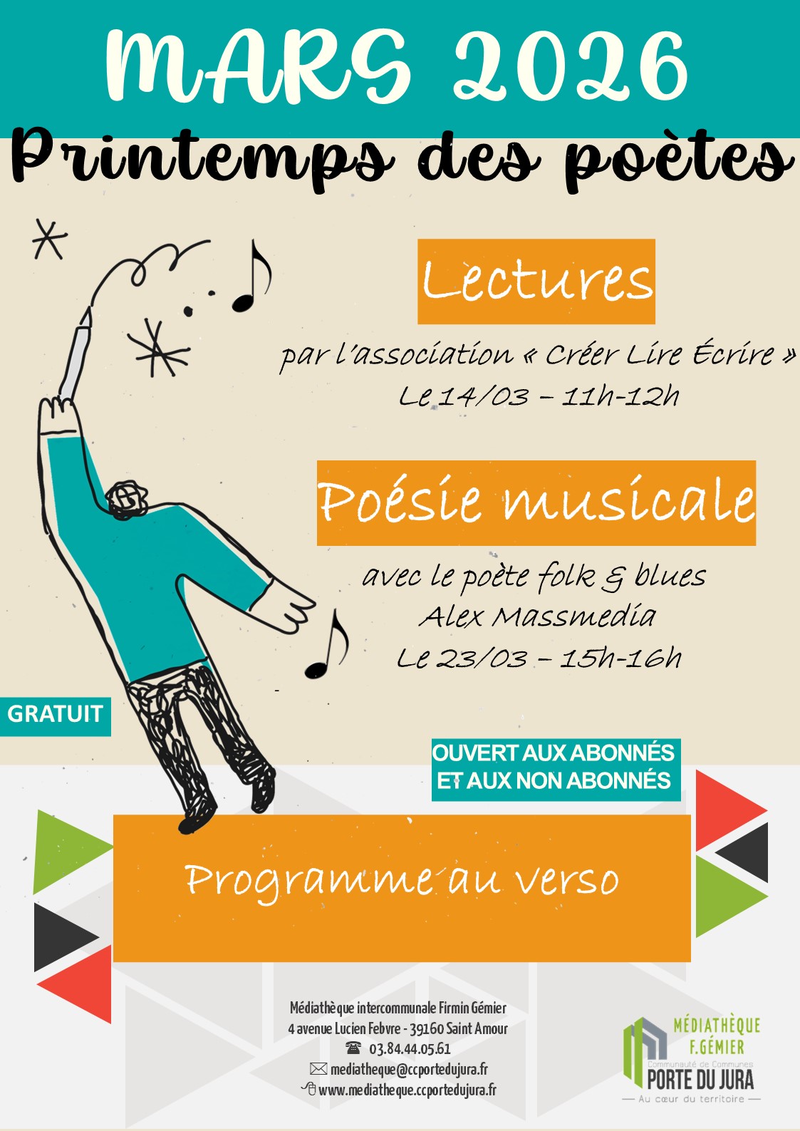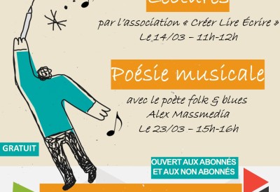 - le mercredi 25 mars - de 15h à 16h: poésie musicale lors d'une rencontre avec le poète folk & blues Alex Massmedia : lectures de poèmes inédits, concert acoustique, conte social « Bébé dragon », échange avec le public.