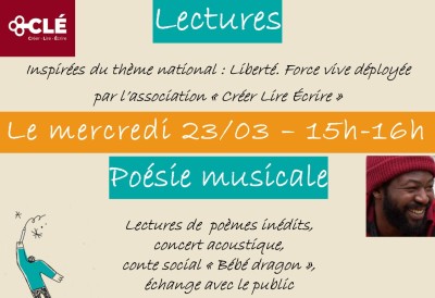 - le samedi 14 mars - de 11h à 12h : lectures poétiques inspirées du thème national : Liberté. Force vive déployée, par l’association « Créer Lire Écrire »