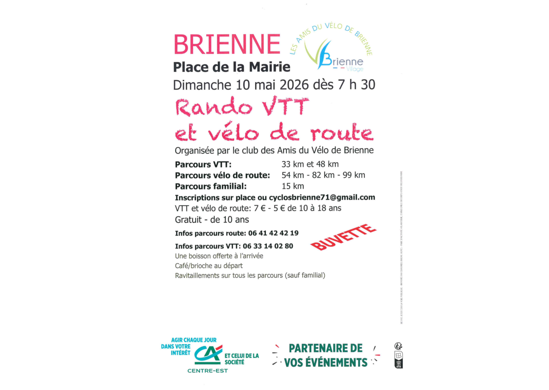2 circuits 33 et 48 km (VTT). Un circuit familial route de 15 km. Circuits cyclo : 54-82-99 km. Ravitaillement et boisson offerte à l'arrivée.