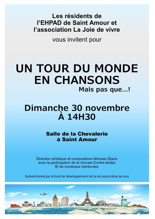 Les résidents de l'Ehpad de Saint-Amour et l'association La Joie de vivre vous invitent pour un tour du monde en chansons mais pas que ... ! l