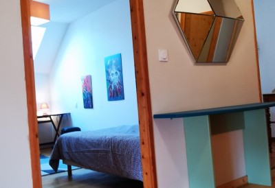 Ce gîte de 110 m2 a été totalement conçu par les propriétaires de manière éco-responsable avec des matériaux sains et écologiques : eau chaude sanitaire au solaire, phyto-épuration, toilettes sèches simple et à séparation, compost, chauffage aux granulés de bois, petite basse-cour, jardin… Ici pas de jeux de vidéo ni de télévision, mais des cabanes, un immense jardin, des sentiers pour se balader, des chevaux, un paon fugueur, des poules loquaces… !