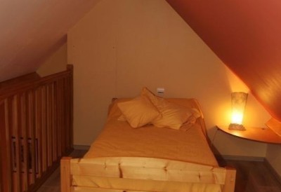 Chambre familiale dans ses tons pastels, elle comprend lit double (160x200) et une mezzanine avec un lit 90 (+ lit d’appoint possible) qui fait le bonheur des enfants. Cette chambre est climatisée et équipée d'une télévision.