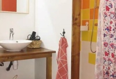 >> La chambre "grand-duc" est constituée de 2 espaces : au rez-de-chaussée, un lit de 140x190, une salle d'eau et un wc séparé , et à l'étage (accès par escalier assez raide) 2 lits 90x190.